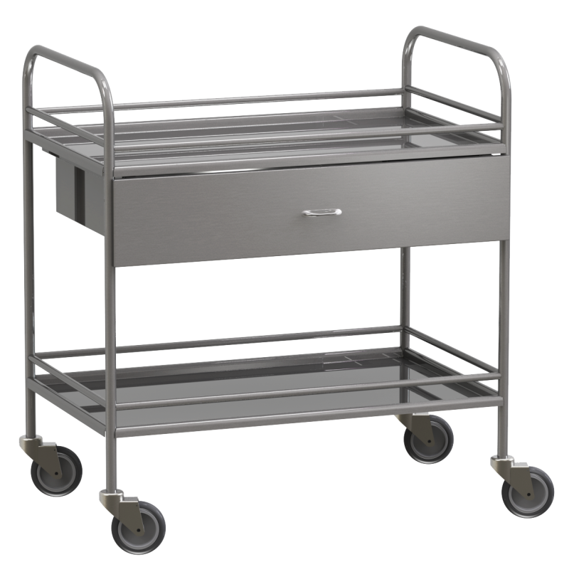 Столик манипуляционный передвижной из нержавеющей стали с бортиками, с двумя полками и выдвижным ящиком