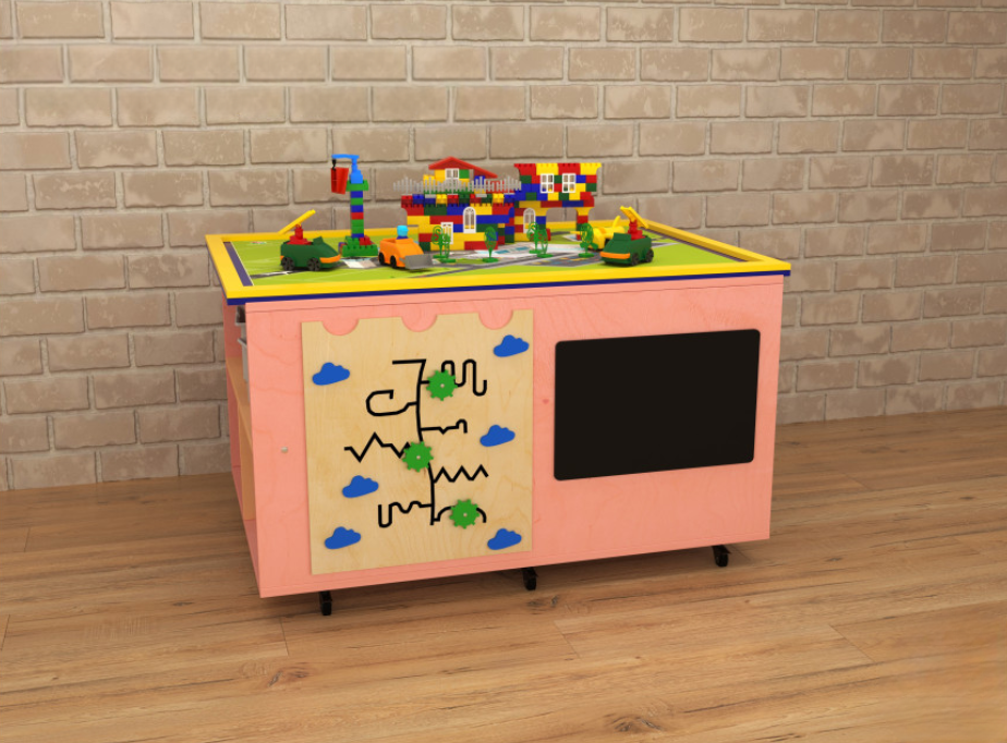 Ландшафтный стол с локацией два берега – многофункциональный развивающий детский игровой модуль. Главное его преимущество – рациональное использование имеющихся площадей – на столешнице расположена ландшафтная локация реки с двумя берегами, а на боках стола – тактильный лабиринт, грифельная доска и полки для хранения игр; все эти преимущества делают стол представленной модели незаменимым элементом оснащения пространства для занятий с детьми. Ландшафтные столы широко используются для групповых и индивидуальных занятий с детьми дошкольного и младшего школьного возраста дошкольными педагогами и некоторыми узкими детскими специалистами – логопед, дефектолог, психолог.