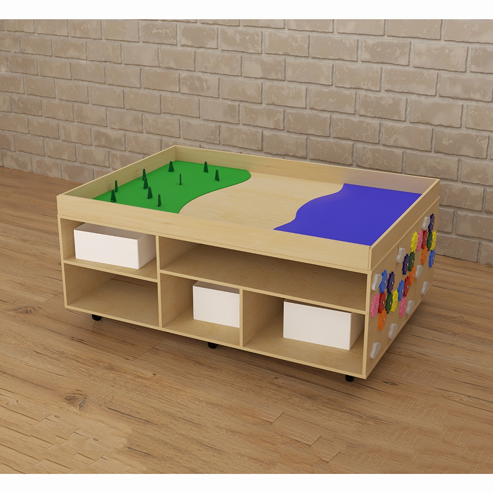 STEAM-стол “Море, суша и лес” – многофункциональный развивающий детский игровой модуль. Главное его преимущество – рациональное использование имеющихся площадей – на столешнице расположена ландшафтная локация, а на боках стола – развивающие элементы и полки-ячейки; это делает его необходимым элементом оснащения пространства для занятий с детьми. Стол имеет колёсики – это позволяет без труда перемещать его сколько угодно раз по помещению, не задействуя большео количество силы и не повреждая напольное покрытие. STEAM столы широко используются дошкольными педагогами и некоторыми узкими детскими специалистами – логопед, дефектолог, психолог – для групповых и индивидуальных занятий с детьми дошкольного и младшего школьного возраста.