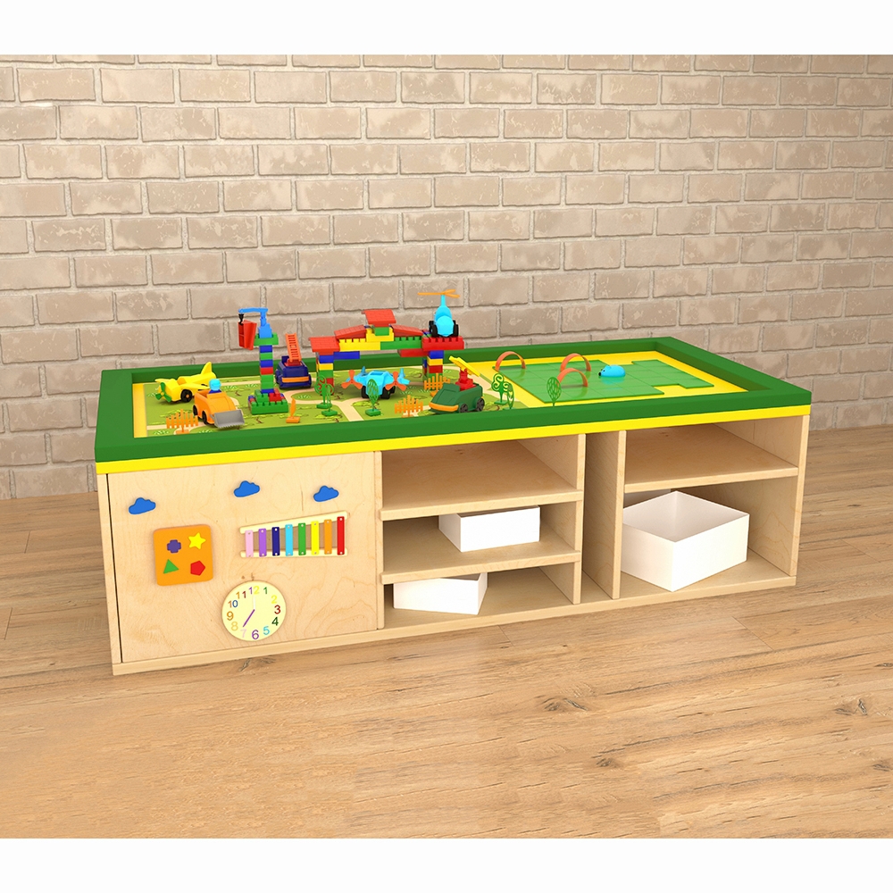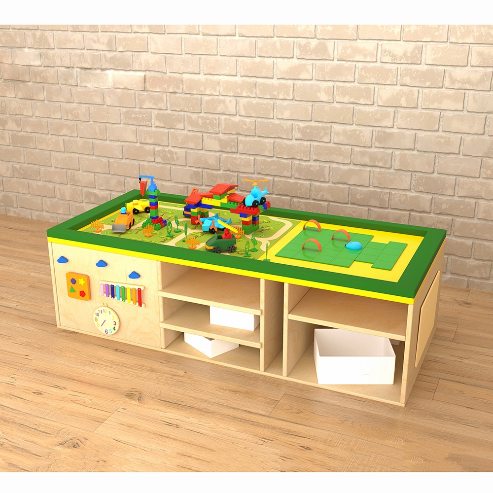 STEAM столы-бизиборды широко используются дошкольными педагогами и некоторыми узкими детскими специалистами – психолог, логопед, дефектолог. За счёт наличия полок-ячеек и расположенных на торцах стола тактильных развивающих элементов и прочих приспособлений для раннего детского развития, а также столешницы с широким потенциалом использования ландшафтный стол-бизиборд можно считать уникальным и необходимым элементом оснащения пространства для занятий с детьми. Основание стола “Весёлые машинки” массивное, неокрашенное, а столешница выгодно выделяется на этом фоне яркими цветами (жёлтым и зелёным) и красочными фигурками машинок и ёлочек. На боковых сторонах стола имеются полочки для хранения игр и развивающие панели, аналог бизибордов.