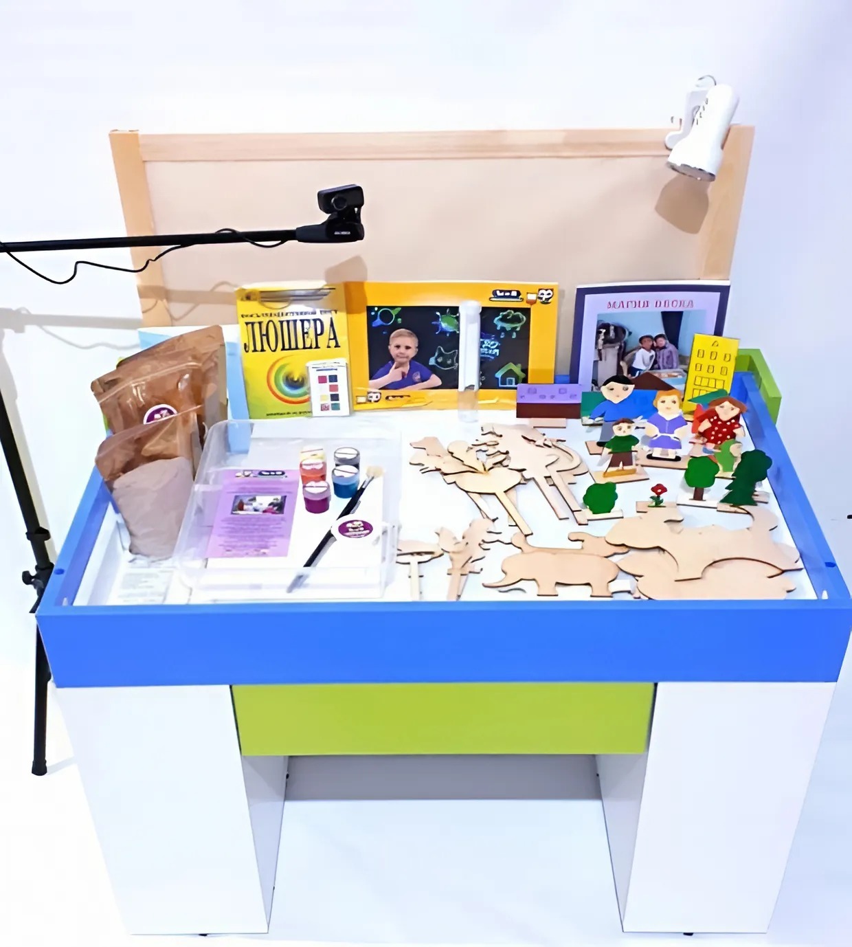 Универсальный модуль для рисования песком, акварелью, театрального, логопедического и психологического развития выполнен в ярких и красочных тонах. Он представляет собой целостную нераздельную конструкцию в виде стола со встроенной светодиодной подсветкой, имеющей функцию переключения цветов и оттенков и технологическими полостями для хранения комплектующих и расходных материалов, входящих в комплект.