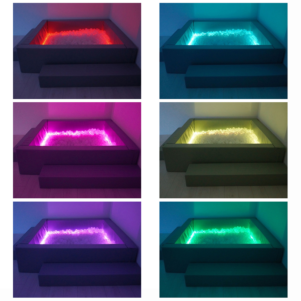 По внутреннему краю бассейна проходит светодиодная подсветка, которая раскрашивает шарики в разные цвета и делает пространство волшебным и удивительным. Подсветка переключается электронным пультом, в ней есть несколько режимов, которые можно подобрать под задачи специалиста.