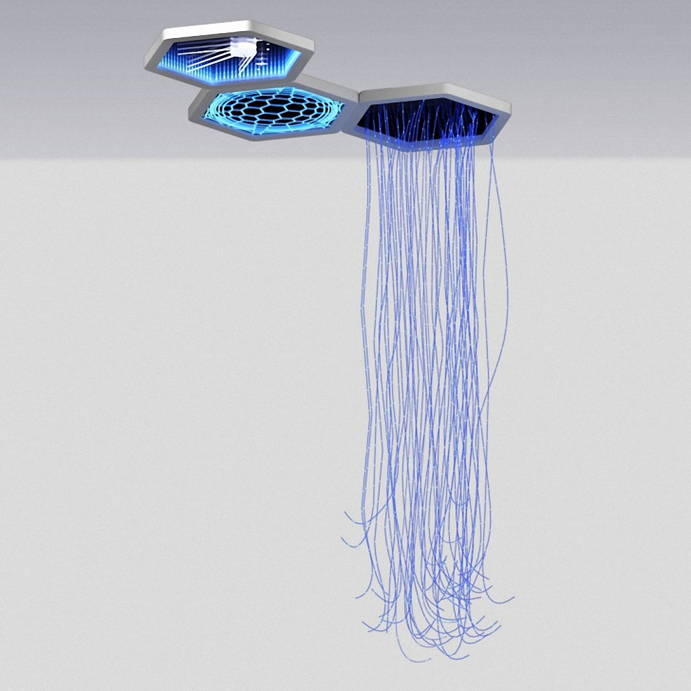 Потолочные панели имеют зеркальную поверхность и расположенную внутри светодиодную подсветку. У каждого светильника различное оформление: