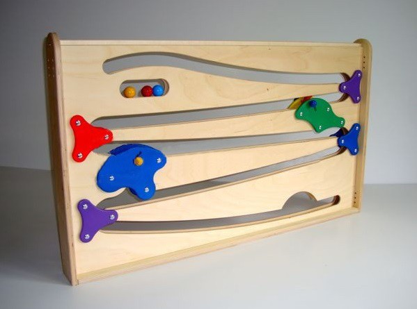 Шарики скатываются сверху вниз по желобу. В панели предусмотрено два шлюза, которые позволяют сбрасывать шарики на нижний уровень. Для этого достаточно потянуть шарик, расположенный на торцевой части панели, вверх. Таким образом шлюз приоткроется и освободит нижний желоб, по которому шарик будет сброшен на нижний уровень.