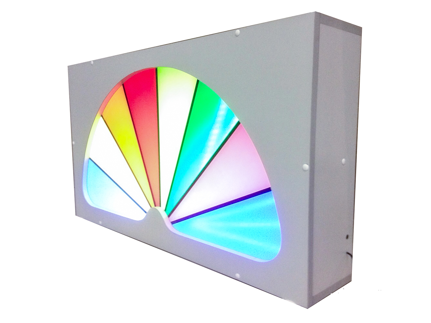 Размер 900х500х150мм. В зависимости от громкости звука загораются ячейки радуги. Материалы: ЛДСП, акрил.
