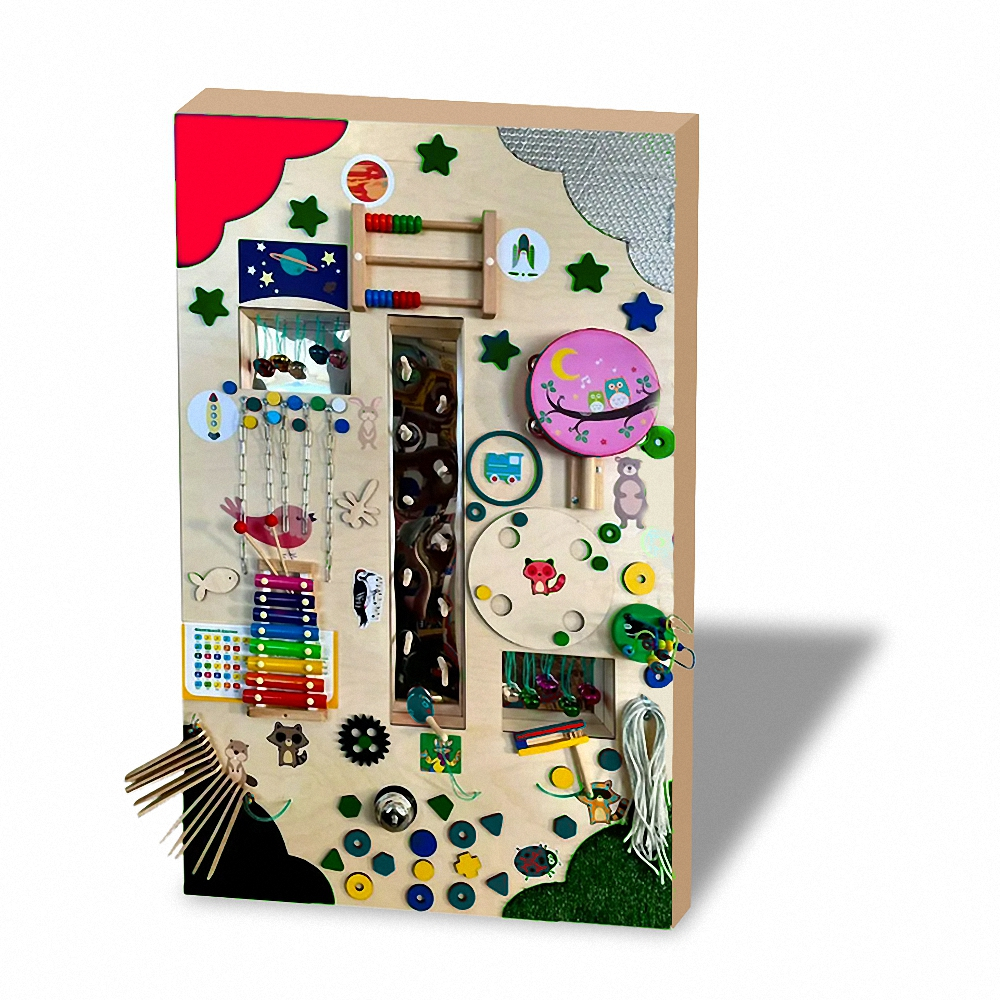 Большая панель "Мир Звуков"- это не просто разные поверхности и предметы, а еще и целый мир различных инструментов, изображений животных и геометрических фигур. На панели находятся колокольчики, металлофон, металлический звонок, бубенцы, маракасы, передвижные счеты, шестеренка и мягкие веревочки. Разные поверхности: мягкий коврик, колючий ковер и холодный, гладкий металл. На панели изображены разные животные, космос и цветные геометрические фигуры. Большая панель "Мир Звуков" заинтересует как маленьких детей, так и постарше, а родителям поможет сохранить дом в целости и сохранности. Акустическая тактильная панель Большая "Мир Звуков" будет верным другом родителей и подойдет для домашнего использования и для специальных учреждений.