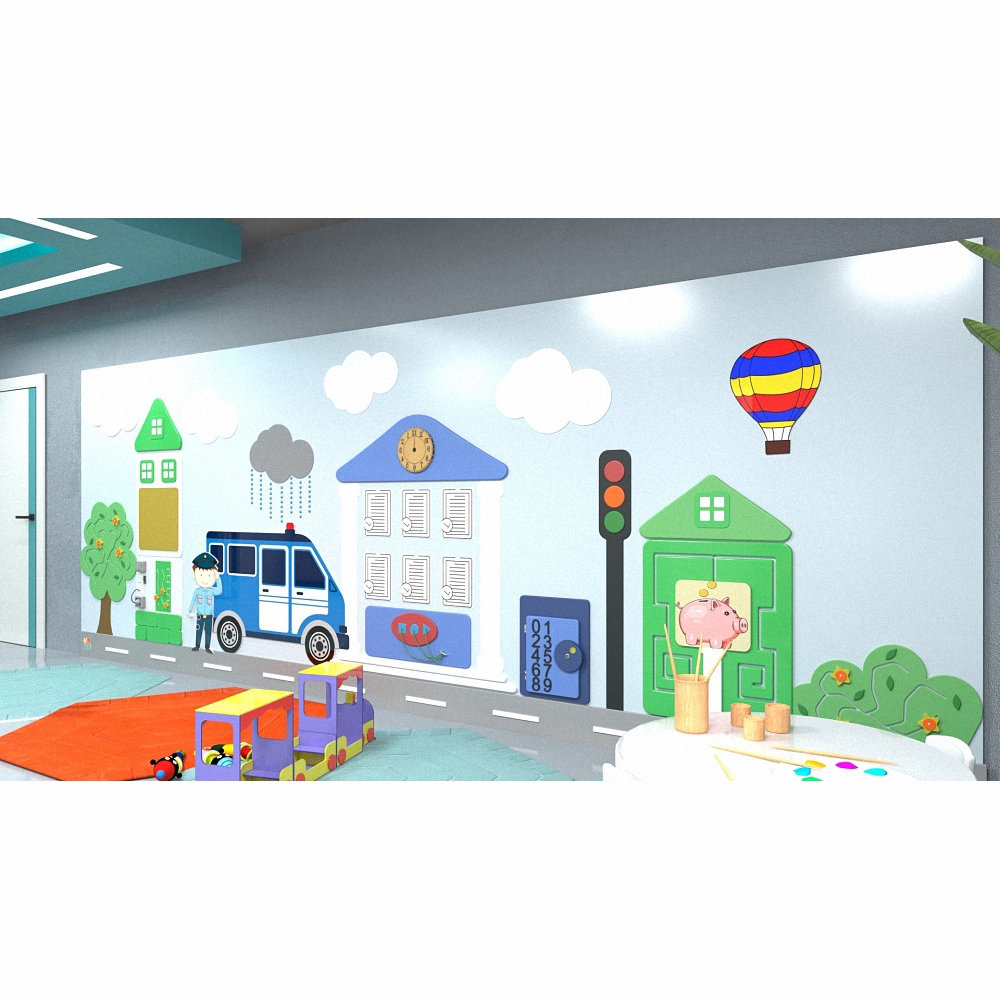 Огромная настенная панель «Банк» - оптимальное решение в вопросе оформления детской игровой зоны для просторных помещений. Выполнена в едином стиле, украшена объёмными, красочными фигурами и оснащена множеством развивающих и развлекательных приспособлений.