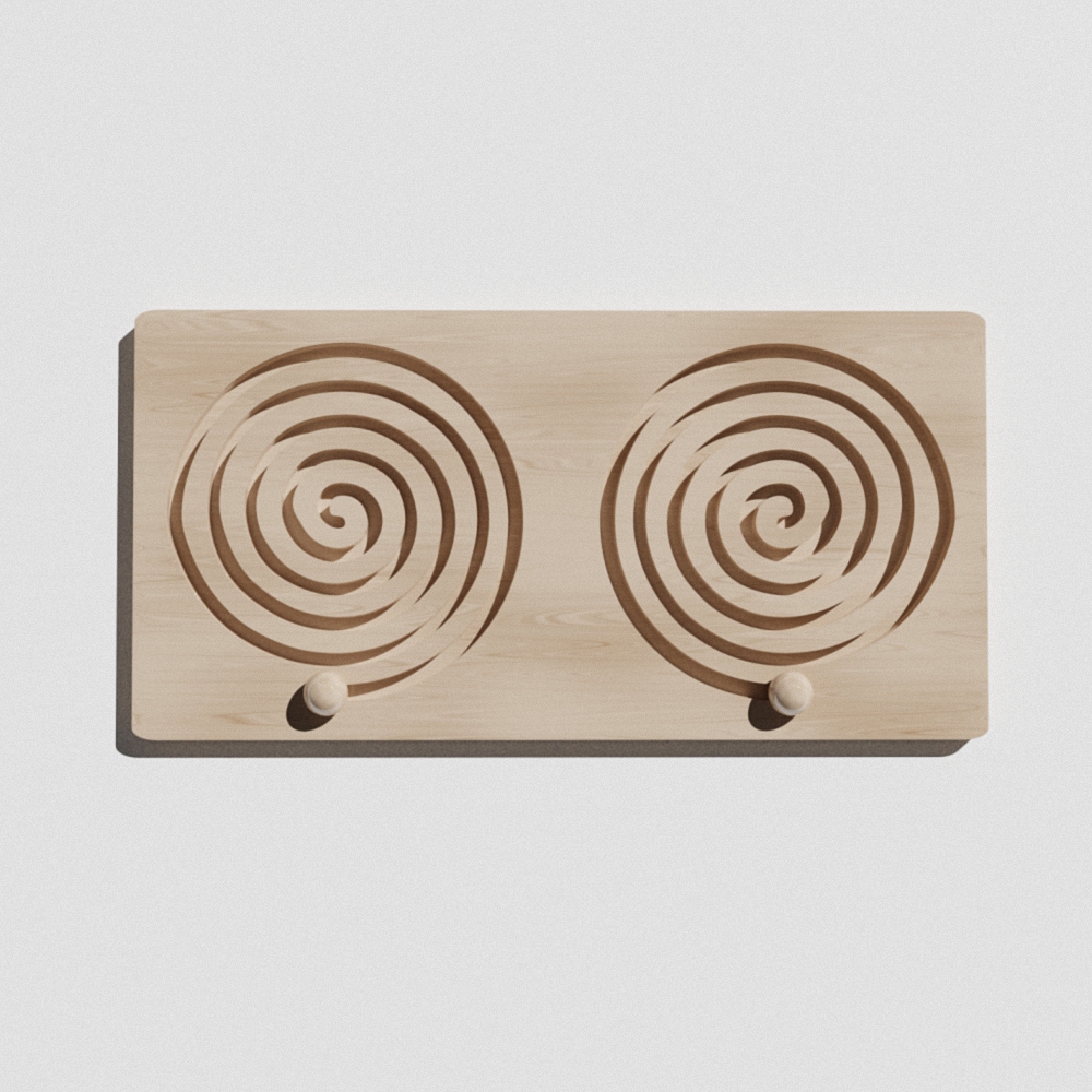 Малышу необходимо взять два бегунка и установить в лабиринте. Сначала двигать кружок по маршрут правой, затем только левой рукой, а после двигаться по траектории лабиринта обоими одновременно по часовой стрелке, а потом против. Упражнение помогает сформировать одновременную работу рук, глаз и обоих полушарий.