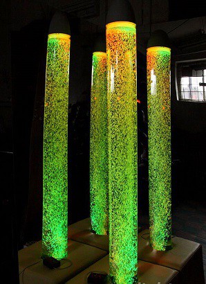 Эффект заключается в множестве поднимающихся на поверхность пузырьков воздуха. Подсветка колонны и поднимающихся пузырьков осуществляется свеодиодными матрицами с большим разнообразием плавно меняющихся оттенков . Зеркальный уголок усиливает эффект.