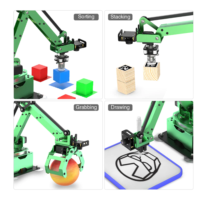 -Сервоприводы: оснащен мощными адресными сервоприводами, обеспечивающими точное и плавное управление манипулятором. -Машинное зрение: имеет широкоформатную камеру, которая позволяет распознавать цвета, жесты и лица. -Встроенные алгоритмы помогут создавать интерактивные проекты Сортировка: может выполнять задачи сортировки, обучая детей навыкам логического мышления.