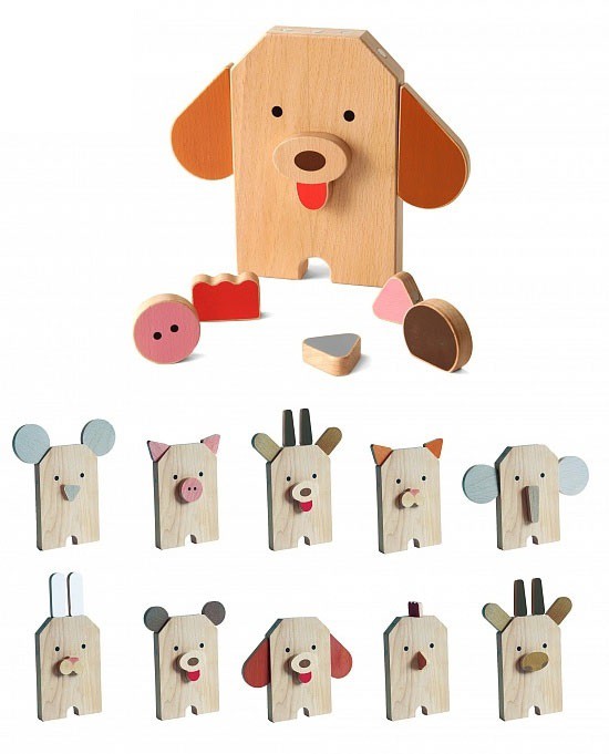 Всего в наборе 27 двусторонних  деталей  (4 головы-основы, 23 детали – «ушки», «рожки», «носы»), соединяющихся при помощи магнитов. Все детали высокого качества, выполнены из дерева, окрашены нетоксичными красками. В комплекте имеется тканевый мешочек для удобного хранения игрового пособия.