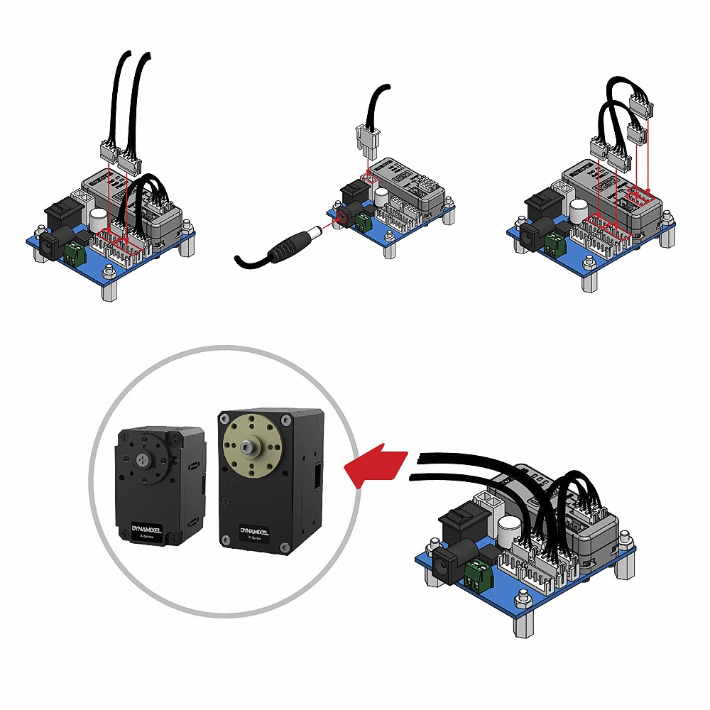 Данное устройство способно подавать питание на все подключенные к нему сервопривода DYNAMIXEL через порт SMPS, клеммный блок или 2-контактный разъем питания.