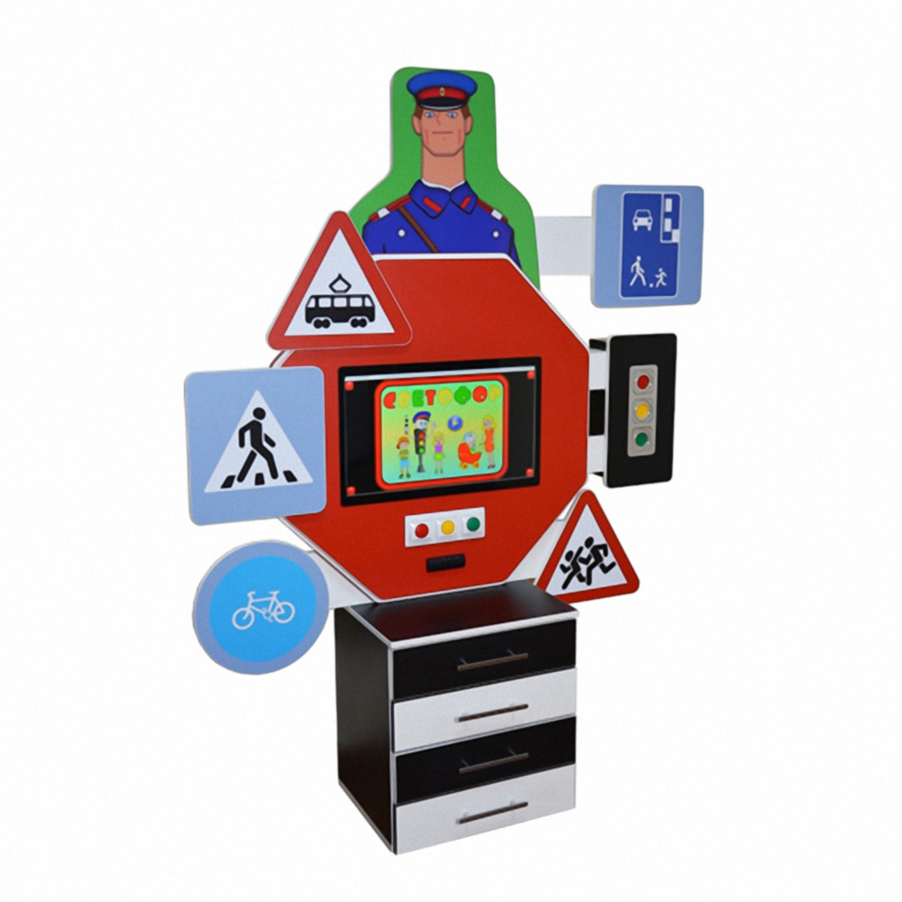 Корпус в виде тумбы с ящиками, на которой размещена интерактивная система с тематическими обучающими элементами (дорожными знаками).