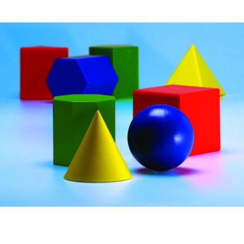 В комплекте 12 разноцветных пластмассовых объемных тел - сфера, цилиндр, конус, куб, трех-, четырех-, пяти-, шести- и восьмигранные призмы, полусфера, трех- и четырехгранные пирамиды. Элементы имеют одну высоту, что позволяет изучать соотношения между площадью, объемом, формой и размером.