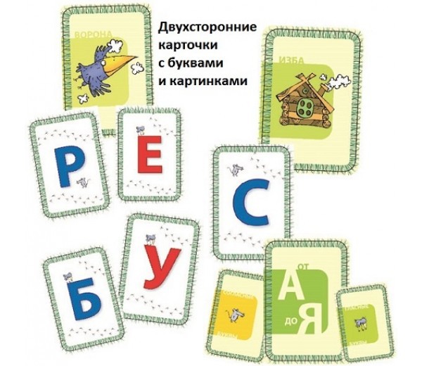 В игре : 36 двухсторонних карточек с буквами и предметами.