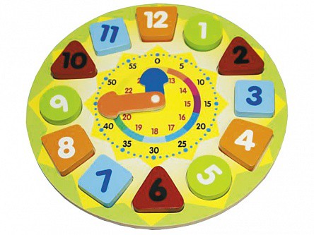 Конструктор представляет собой круглую деревянную основу в виде часового циферблата с часовой и минутной стрелками. Вместо делений для обозначения часов сделаны углубления разной формы. Для определения времени используются цветные деревянные фигуры, соответствующие по форме углублениям в циферблате и на которых обозначены числа, показывающие деление времени на часы и минуты.