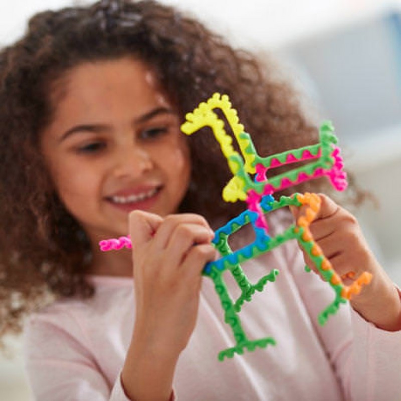 Конструктор 20 деталей (гибкие 3D стержни). В 5 ярких цветах: розовый, оранжевый, желтый, зеленый и синий. Включает в себя многоязычное руководство деятельности, чтобы вы начали. Удобная банка для хранения 12 х 10см