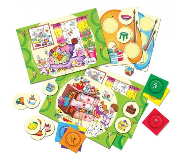 В игре6 сюжетных картин, 9 карточек-палитр, 6 цветных квадратов, 36 карточек с предметами, кубик с наклейками