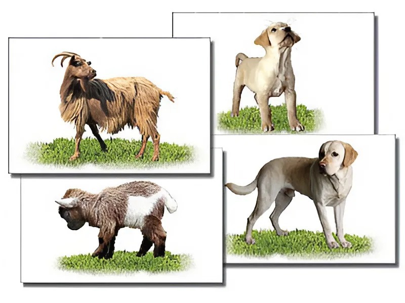 На карточках изображены корова, теленок, овца, ягненок, свинья, поросенок, коза, козленок, лошадь, жеребенок, собака, щенок, кошка, котенок.