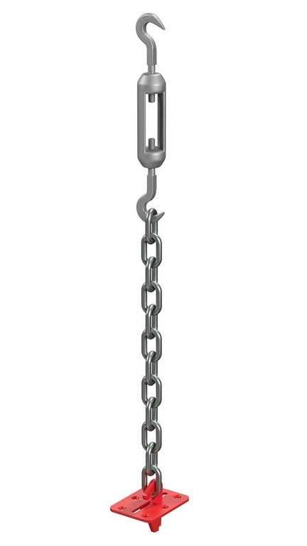Крепление состоит из пластины с убирающимся крюком (устанавливается вровень с полом и в не рабочем состоянии не мешает спортсменам заниматься в спортивном зале), цепи и талрепа.