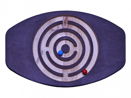 Балансировочная доска-лабиринт представляет собой планшет в форме круга, снабженный эргономичными подножками для управления движением игрового шарика в процессе балансирования и полусферической опорой. Игровое поле панели снабжено сетью бороздок прямоугольного профиля в форме концентрического лабиринта.