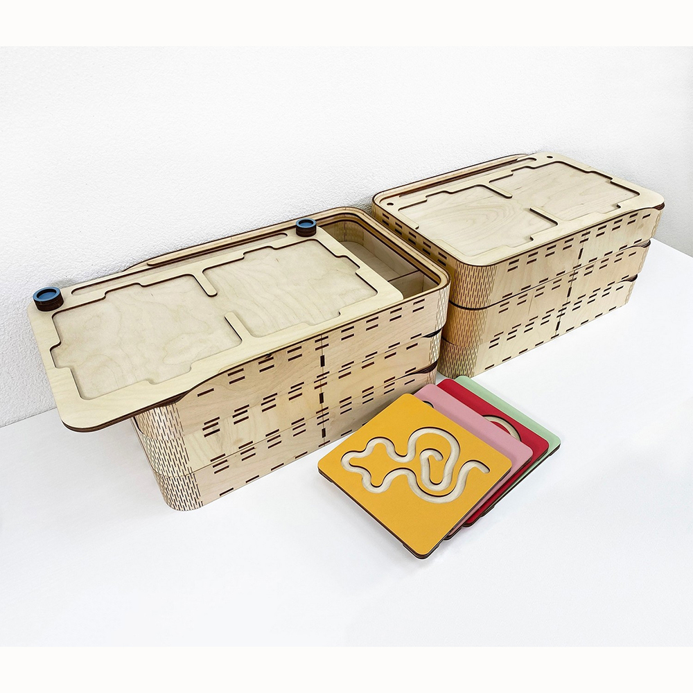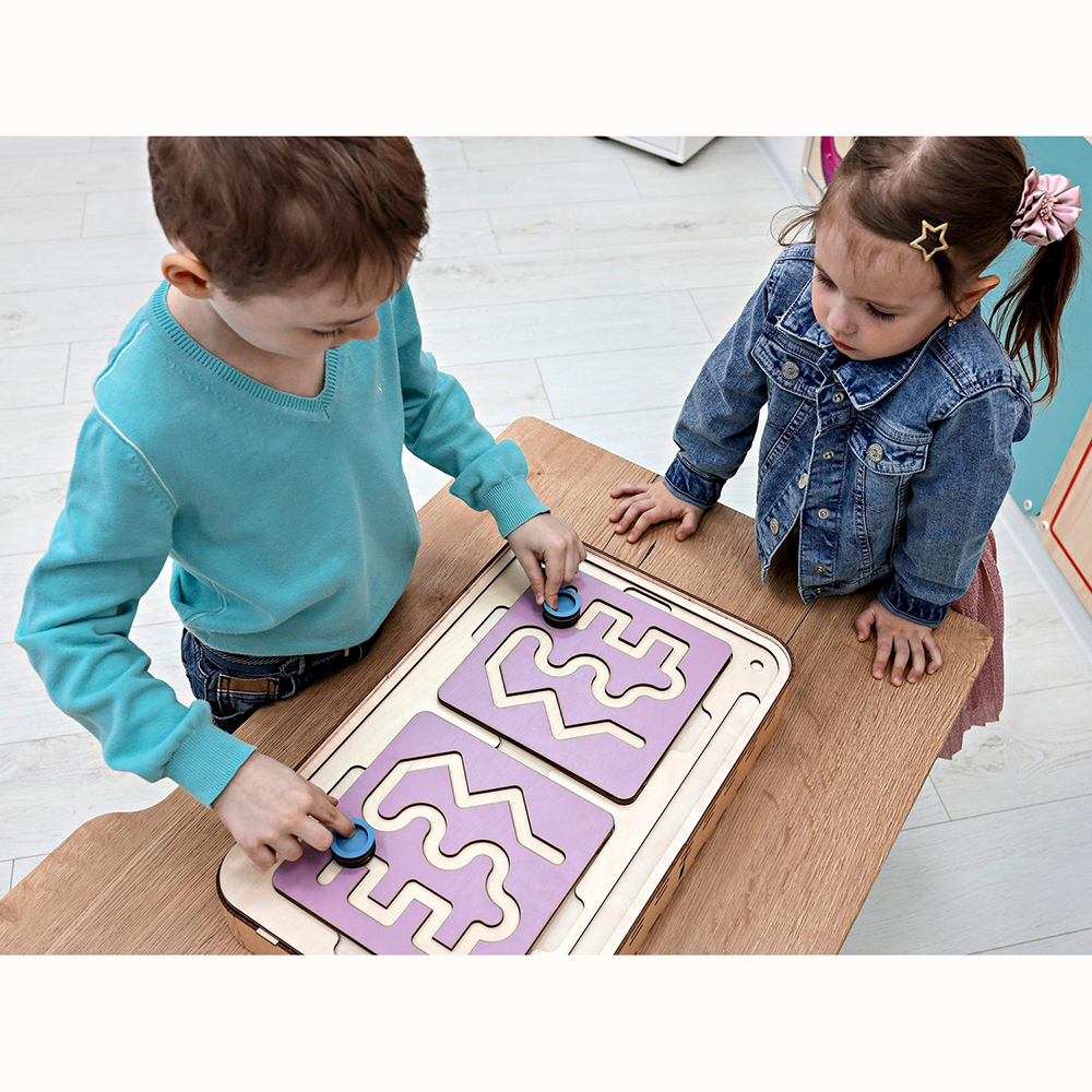 Это нейроигрушка для развития межполушарного взаимодействия. Состоит из коробки-основания и цветных лабиринтов-вкладышей. Два лабиринта с зеркально изображёнными картинками устанавливаются в пазы, и ребёнок проходит их с помощью специальных пальчиковых фишек.