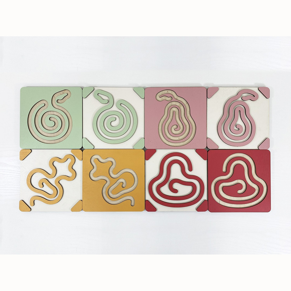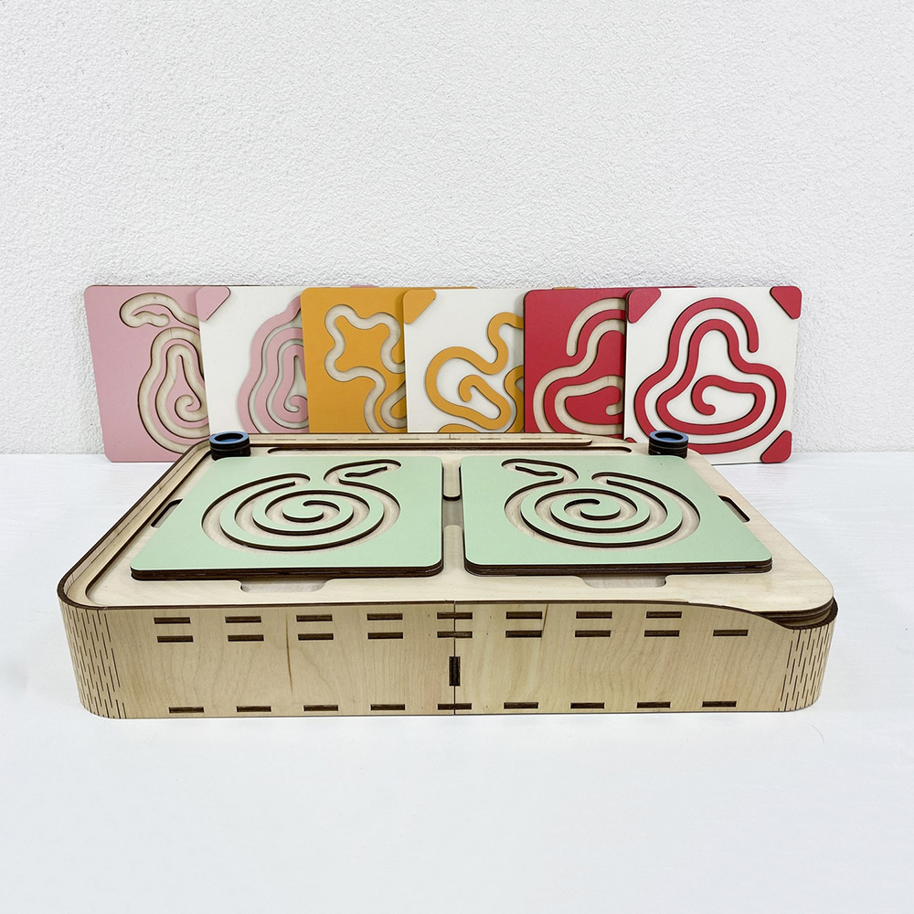 Это нейроигрушка для развития межполушарного взаимодействия. Состоит из коробки-основания и цветных лабиринтов-вкладышей. Два лабиринта с зеркально изображёнными картинками устанавливаются в пазы, и ребёнок проходит их с помощью специальных пальчиковых фишек.