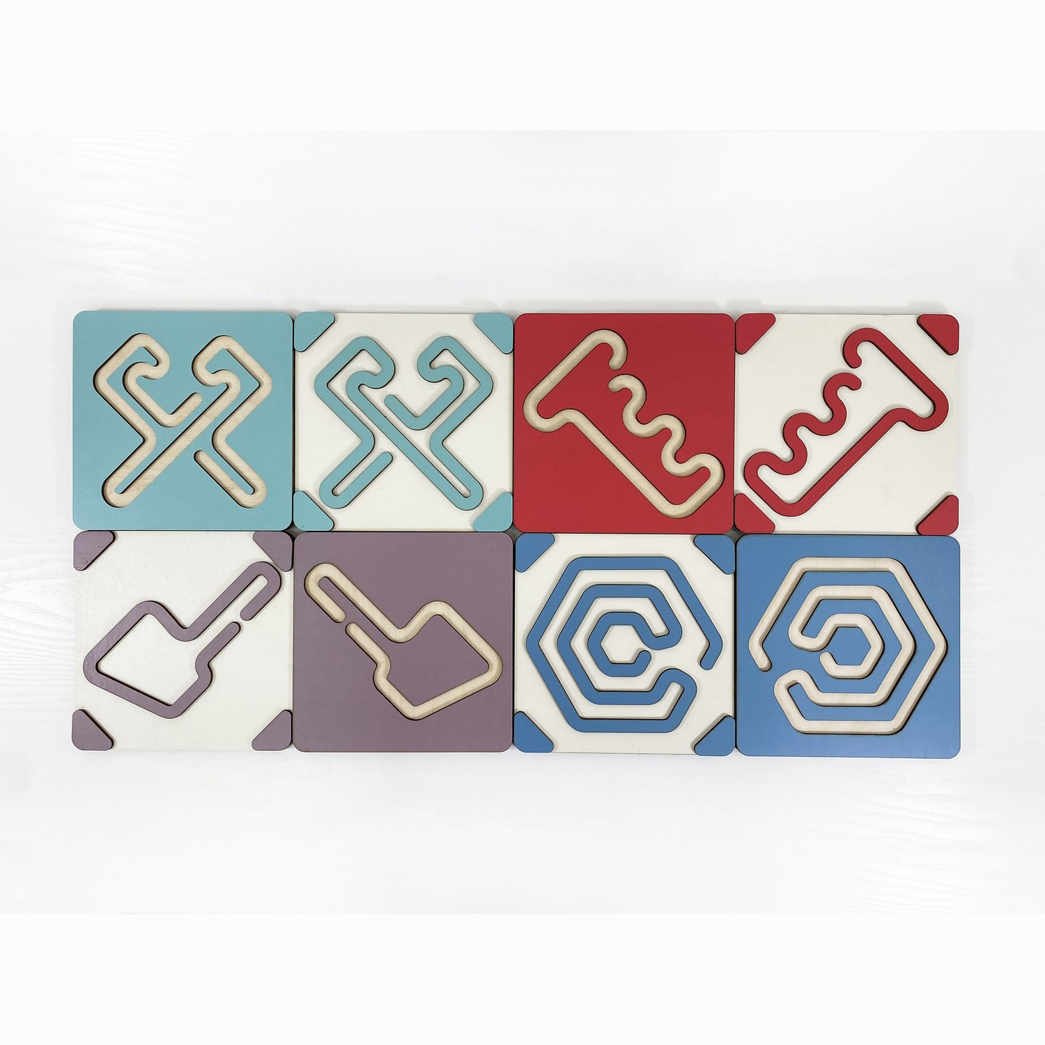 Это нейроигрушка для развития межполушарного взаимодействия. Состоит из коробки-основания и цветных лабиринтов-вкладышей. Два лабиринта с зеркально изображёнными картинками устанавливаются в пазы, и ребёнок проходит их с помощью специальных пальчиковых фишек.