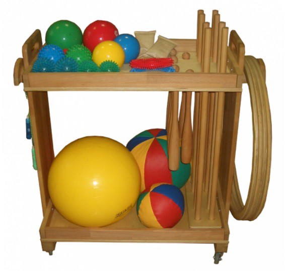Комплектация для занятий с детьми от 3 лет. Наполнение тележки включает в себя: 8 гимнастических палок из натурального дерева, 6 булав из натурального дерева, 4 обруча из натурального дерева, комплект мячей (в т.ч. мяч гимнастический, мячи игровые и мячи утяжеленные мягконабивные, мячи типа «ежик»), кольцо массажное типа «ежик», скакалку, гантель, комплект мешочков для метания.