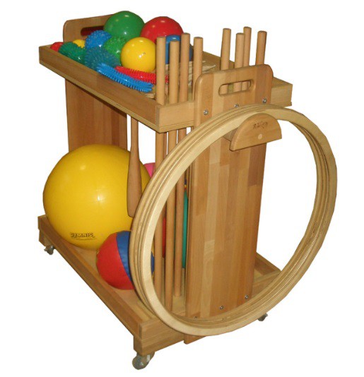 Тележка из натурального дерева на колесах с тормозами. Предназначена для хранения гимнастических снарядов для занятий лечебной физкультурой в условиях специализированных реабилитационных и гимнастических залов.