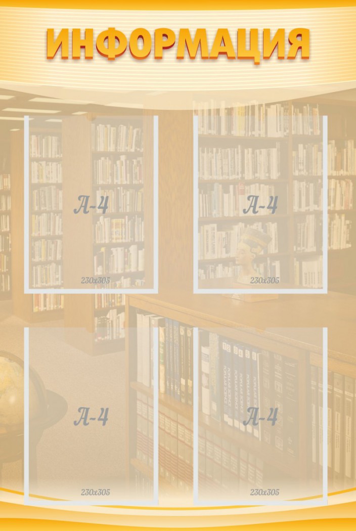 Как часто дети не соблюдают дисциплину в библиотеке не потому, что делают это специально, а потому что не знают основных правил поведения в ней. На таком стенде можно поместить информацию с правилами поведения в библиотеке, ознакомить с персоналом библиотеки, с правилами пользования книгами и т.д. На стенде нанесено изображение библиотечных стендов, что призывает школьников содержать книги в порядке и определенной последовательности. Стенд небольшого размера, поэтому он будет привлекать внимание посетителей библиотеки, в том числе и в очереди за желаемой книгой. Стенд оборудован четырьмя удобными карманами для размещения информации.