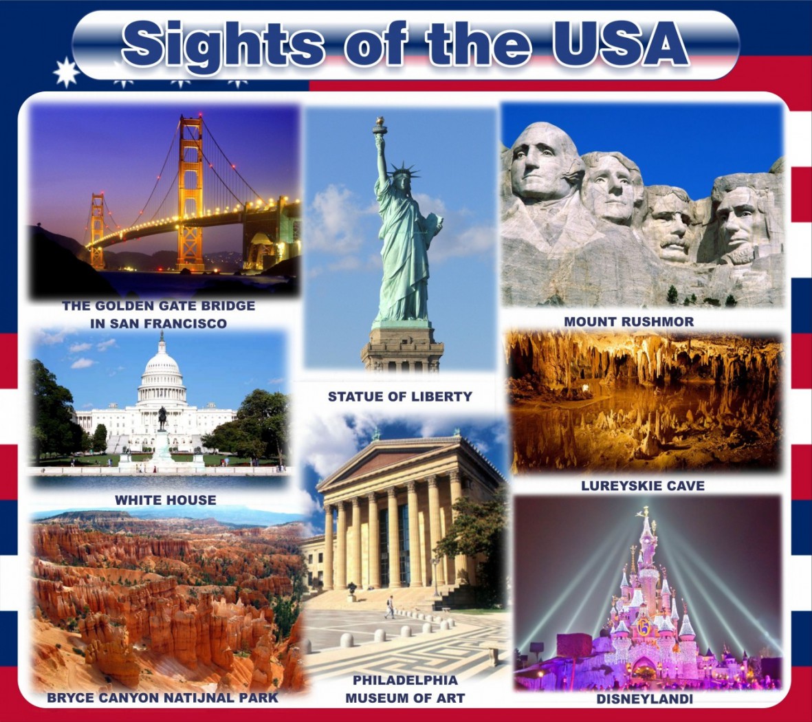 Стенд расскажет о восьми самых узнаваемых во всём мире достопримечательностях Соединенных Штатов Америки: мост Золотые Ворота и Белый дом,  впечатляющий Национальный парк и  удивительная гора Рашмор , неизменная Статуя Свободы и Музей искусства в Филадельфии, Лурейские пещеры и праздничный Диснейленд.