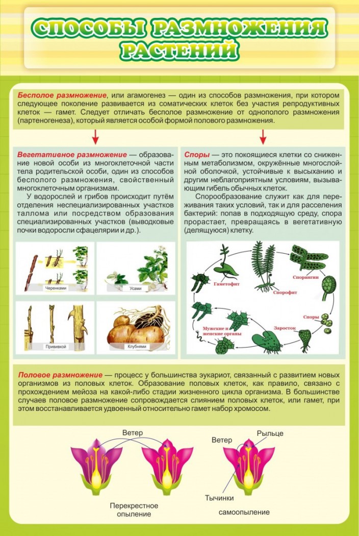 Настенный прямоугольный школьный стенд "СПОСОБЫ РАЗМНОЖЕНИЯ РАСТЕНИЙ" понятно продемонстрирует учащимся схему спорового вегетативного и полового (эукариоты) размножения растений.