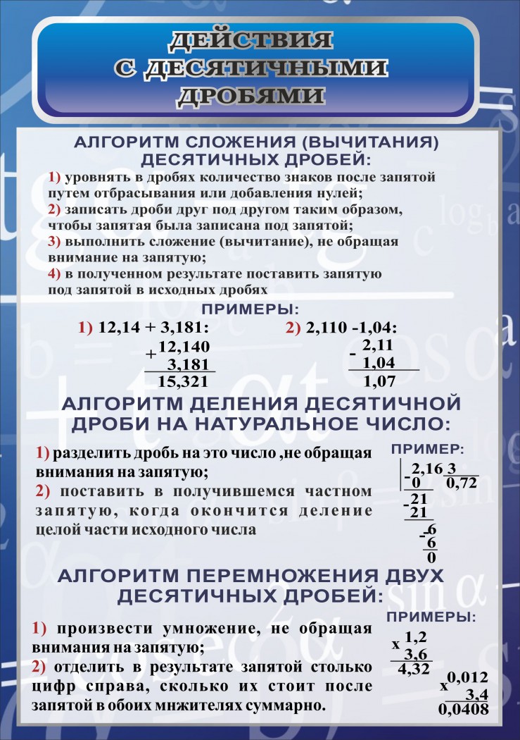 Стенд "Действия с десятичными дробями"