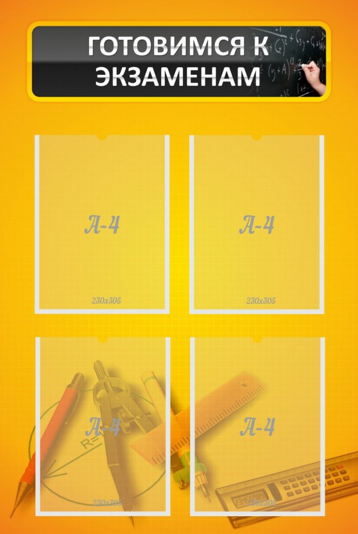 На этом стенде приятного солнечного оттенка есть четыре специальных кармана A4. В них можно поместить всю полную информацию о подготовке к экзаменам. Возможно, учителя выделят один карман либо два, для подготовки к определенному экзамену. Либо используют все четыре кармашка для того, чтобы помещать туда важнейшую информацию, связанную с предстоящими конкретными экзаменами. Отличный дизайн этого стенда, даже самих учеников, заставит улыбнуться и не относиться слишком плохо, к надвигающимся экзаменам. В любом случае, карманы очень удобные, и достать из них нужную информацию, сможет каждый желающий.
