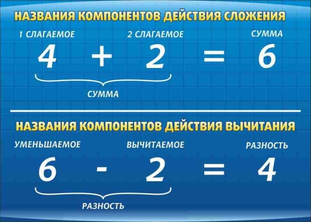 Такие действия, как вычитание и сложение – основа основ математической науки. Так что пренебрегать ими, не стоит, в любом случае. Отличная таблица на простом примере, излюбленном у многих преподавателей математики, показывает школьникам, что же такое «сложение» и «вычитание». Мало кто из учеников, может не понять подобного легкого объяснения. Великолепный дизайн стенда без различных излишеств, так же относится к плюсам предлагаемой таблички. Синий, белый и желтый оттенки, использованы в процессе создания этого стенда. Такие цвета приятны для глаз. Соответственно и со зрением проблем, ни у кого не появится.