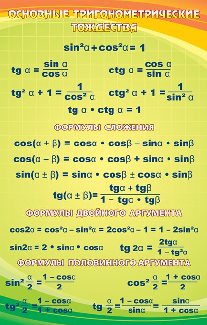Сложно это или нет, решать определенным ученикам, так как каждый из школьников, наверняка ответить по-разному. Тем не менее, факт - без «синусов» и «косинусов», жизни представить в дальнейшем, не сможет ни один ученик. По крайней мере, собственной жизни в школьное время. И, безусловно, любому среднему учебному заведению, нужно позаботиться о том, чтобы ученики лучше запоминали основы основ, по теме довольно непростой, но интересной. Стенд с ярким дизайном, похожим на оперение разноцветного попугайчика, не будет отвлекать от серьезного отношения к названной теме. Так что формулы двойного аргумента, ровно, как и половинного, запомнятся на ура!