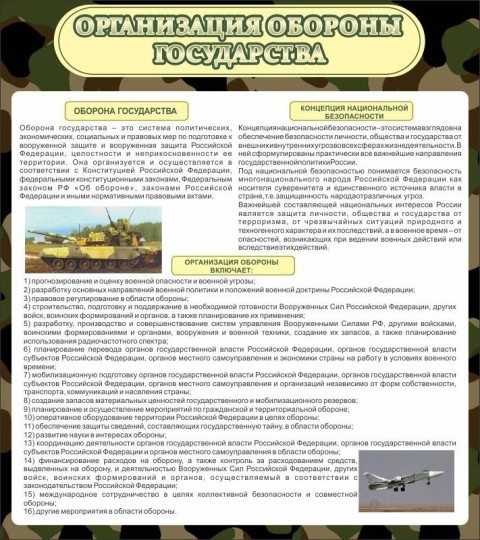 Каждый ребенок с начальных классов должен владеть информацией, как происходит оборона государства, в котором он живет. В учебных заведениях должен присутствовать стенд с соответствующими статьями, которые воспитывают понимания политический военных конфликтов и позволяют ученикам самостоятельно анализировать последствия их для государства. Стенд «Организация обороны государства» имеет информацию о концепции обороны, организационных вопросов и разнообразных оценок. Фон имеет картинки в высоком качестве и оформления в стиле хаки, что хорошо подходит тематическому содержанию заставляя обратить на него внимания.
