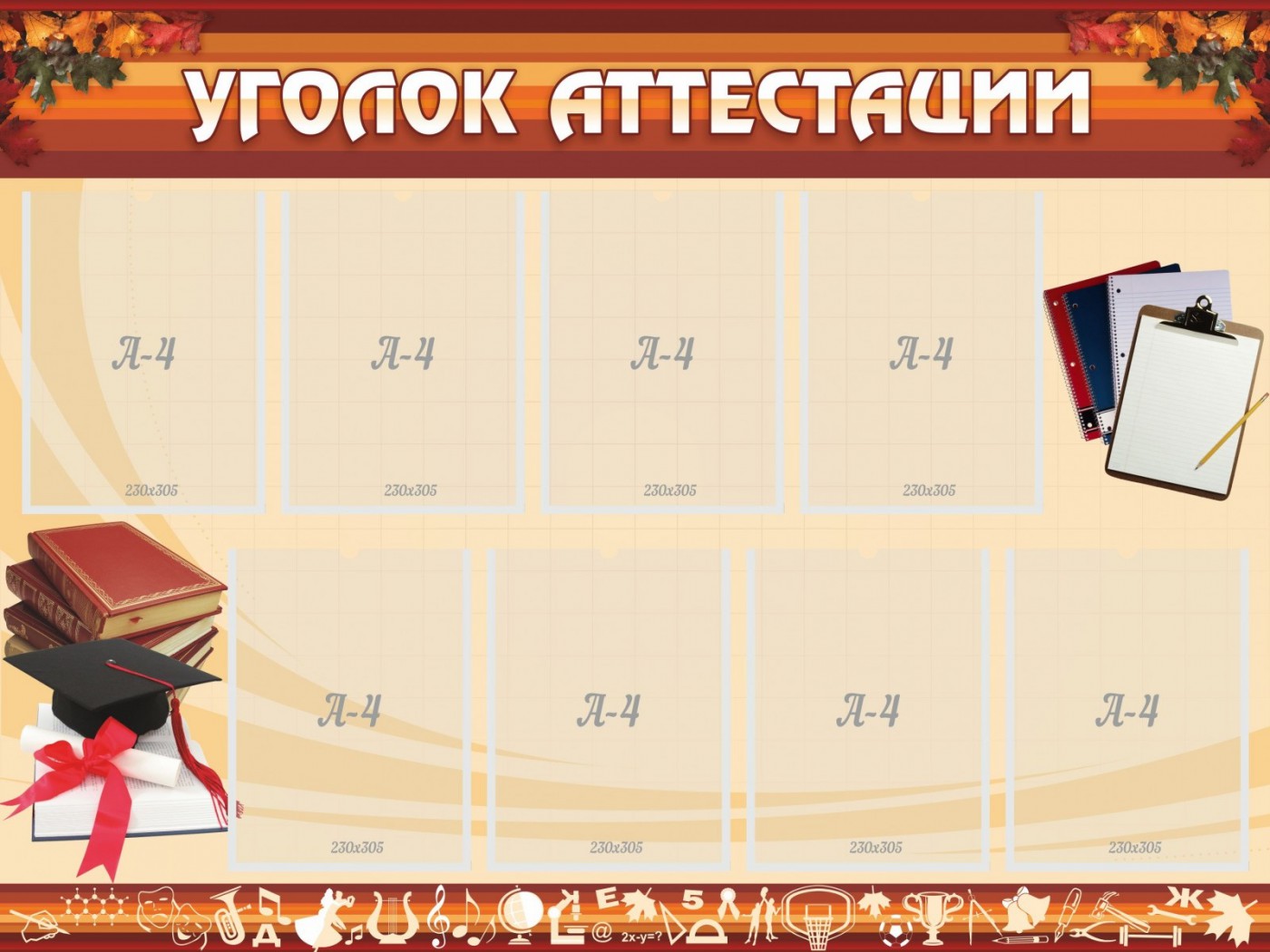 Что может быть важнее для учителя, как не период аттестации. Множество информации, расписаний, графиков, ведомостей – все это просто не возможно удержать в голове. Для этого теперь есть стенд «уголок аттестации». Его главным преимуществом можно считать большое количество секций для листов формата А4. Всю главную информацию можно разместить в восемь карманов, при необходимости можно легко заменить необходимые листы, благодаря наклонному дизайну каждой секции. Качественный материал и не яркий рисунок делают стенд «уголок аттестации» просто находкой для любой учительского кабинета.