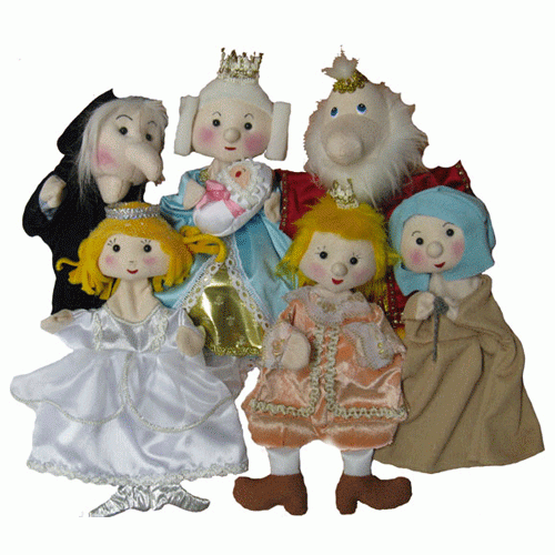 Набор состоит из 6 перчаточных кукол: Король, королева, колдунья, красавица, принц, пряха.