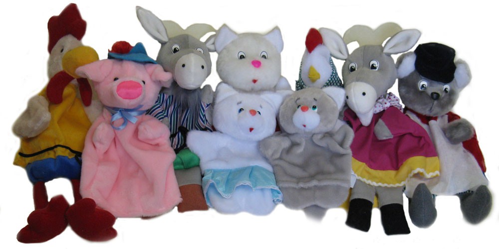 Набор состоит из 9 перчаточных кукол: Кошка, кот-дворник, котенок-девочка, котенок-мальчик, козел с козой, петух с курицей, свинья.