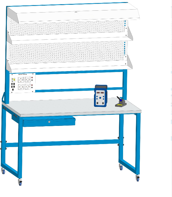 Стойка оснащена двумя полками и навесом со светильником, для освещения рабочей области. Задняя сторона стойки закрыта перфорацией из металла.