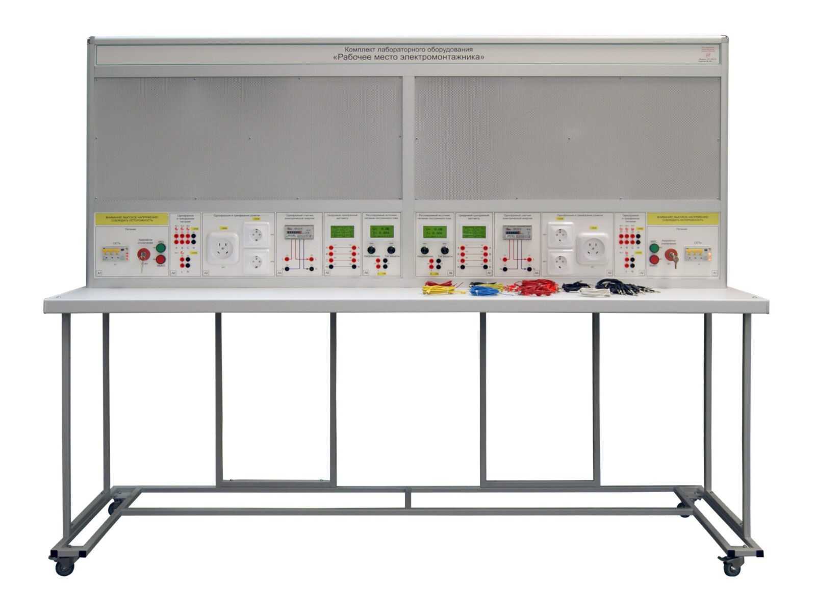 Комплект лабораторного оборудования «Рабочее место электромонтажника» выполнен в стендовом исполнении, монтажная панель. Комплект представляет собой два независимых и самодостаточных рабочих места электромонтажника.
