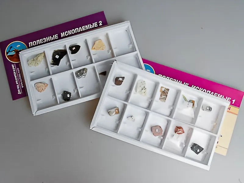Образцы пронумерованы соответственно списку и разложены в две коробки с ячейками. Пособие комплектуется руководством по эксплуатации и ламинированным вкладышем, содержащим информацию о внешнем виде, месторождениях и применении полезных ископаемых.