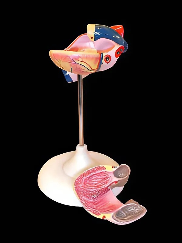 На модели цветом выделены следующие детали строения сердца: 1. Легочный ствол. 2. Левое ушко. 3. Передняя межжелудочковая артерия. 4. Большая вена сердца. 5. Левый желудочек. 6. Правый желудочек. 7. Правая венечная артерия. 8. Правое ушко. 9. Дуга аорты. 10. Верхняя полая вена.