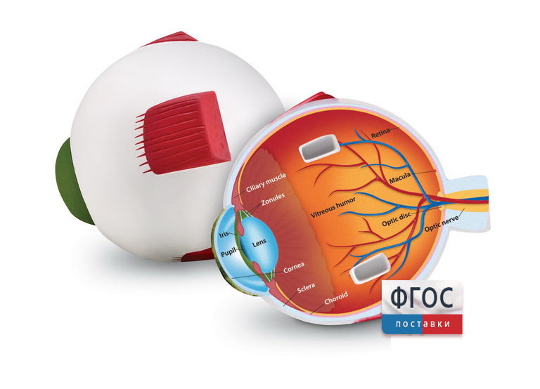 Реалистично подробная пластиковая модель глаза разделяется на половинки и на одной половинке имеет названия частей глаза (на английском языке), на другой половинке - только буквенное обозначение, для самостоятельной проверки.