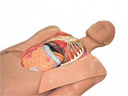 Тренажер предназначен для проведения вскрытия грудной и брюшной полостей с последующей имитацией проведения оперативного вмешательства на органах указанных полостей. Манекен также служит наглядным пособием для изучения раздела нормальной анатомии человека "Спланхнология".