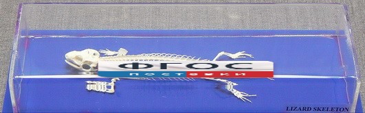 Остеологическая модель представляет собой скелет ящерицы, смонтированный с сохранением естественного положения тела животного и защищенный от механических повреждений прозрачным пластиковым колпаком.