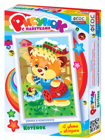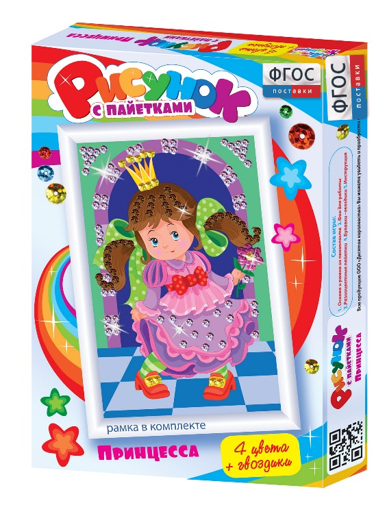 Комплект "Рисунки с пайетками" ГЛ-1 включает в себя 3 набора. В каждом наборе пайетки 4 цветов + гвоздики, фон с нанесенным рисунком, основа из пенопласта, подробная инструкция.